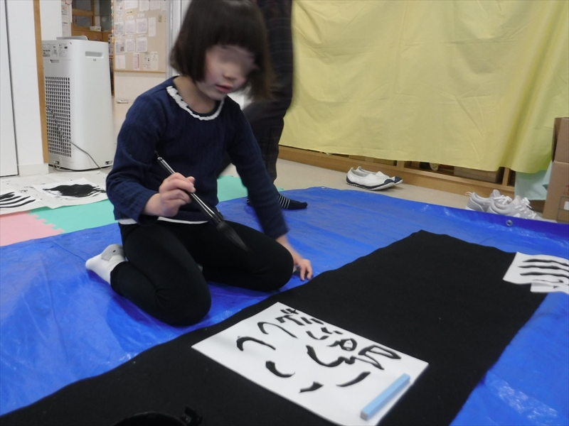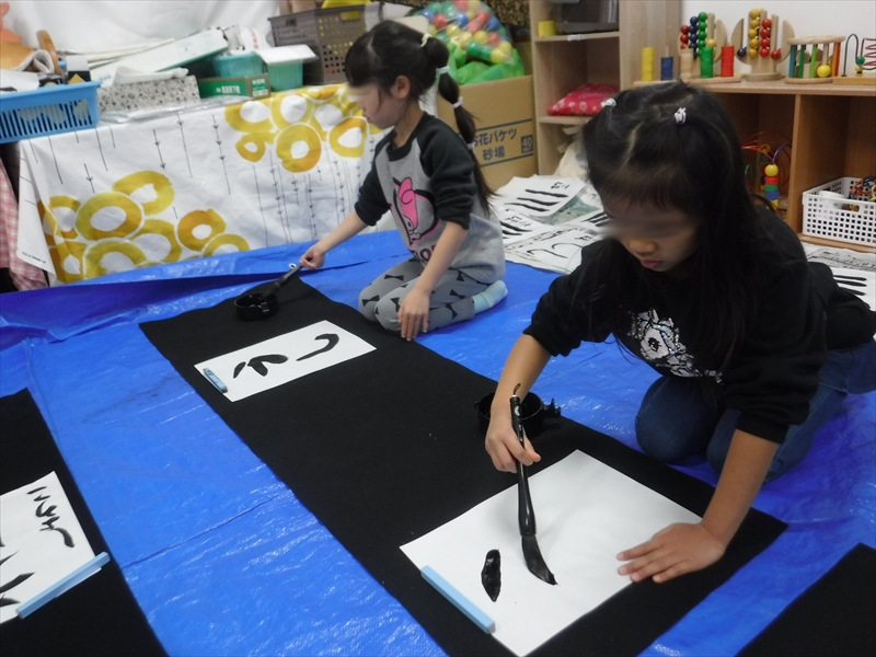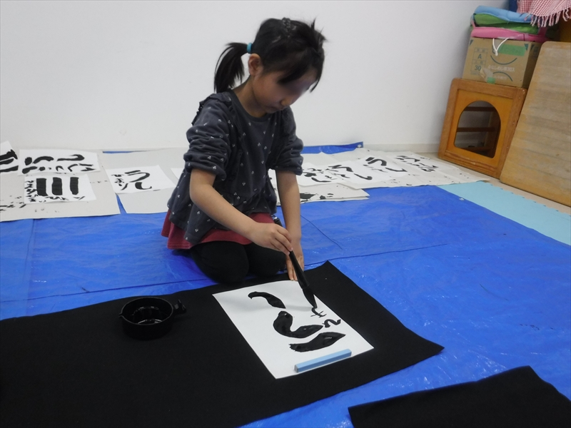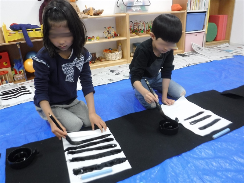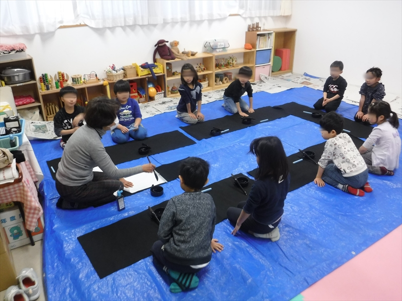 まず園長のお手本です。ここでも直線の姿勢や筆の持ち方、道具の扱い方を習います。