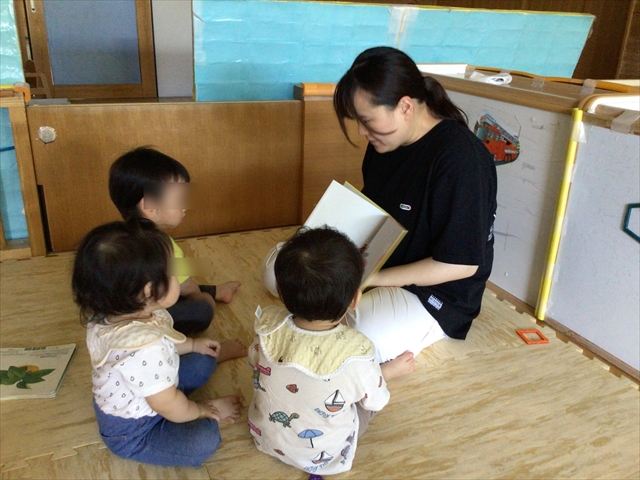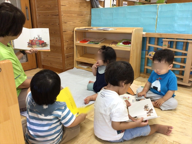 保育者に絵本を渡して読んでもらっています。大好きな絵本を大好きな人に読んでもらう時間は何ものにも代えられません。真剣な背中が物語っていますね。