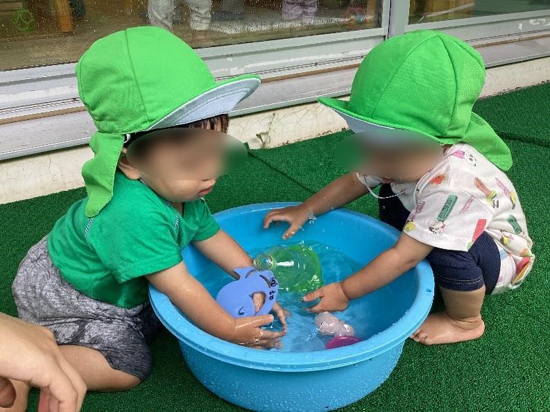 タライの中に玩具を浮かべたり、容器に水を入れたり出したり、また、水面をバシャバシャさせて水しぶきがかかるのも楽しいね!