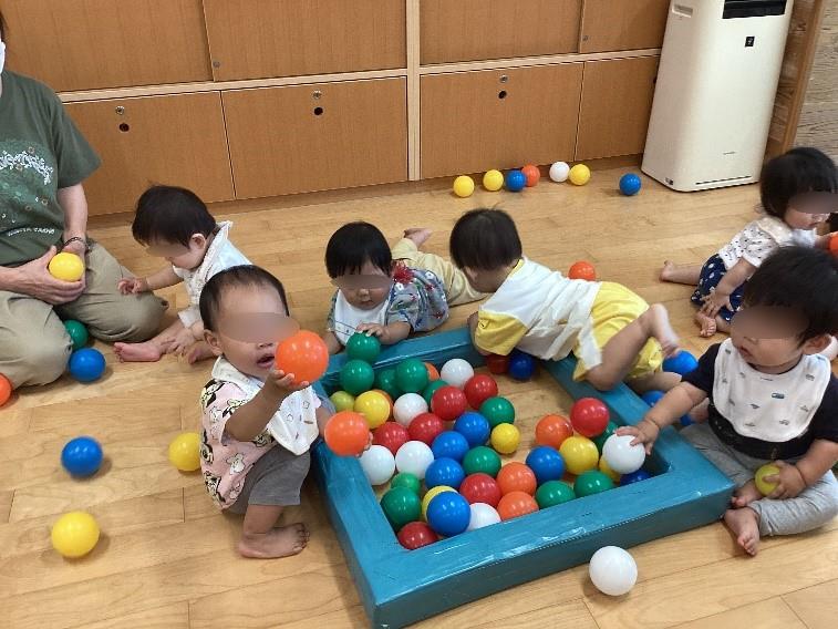 こちらは、ひよこ組で今人気のボールプールです。色とりどりのボールを手に取り、転がるボールをハイハイで追いかけたり、投げたりして笑顔があふれます。最近は四角いサークルの中に自ら入り、お風呂でゆったりとくつろいでいるような姿も見られてかわいいですよ。