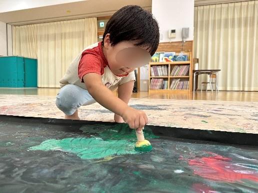 筆や手を使って絵の具遊びを楽しむ姿も見られました。