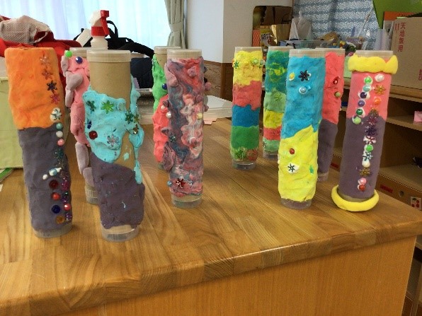 シールを貼ったり模様を描いたりオリジナルの作品が出来上がりました。