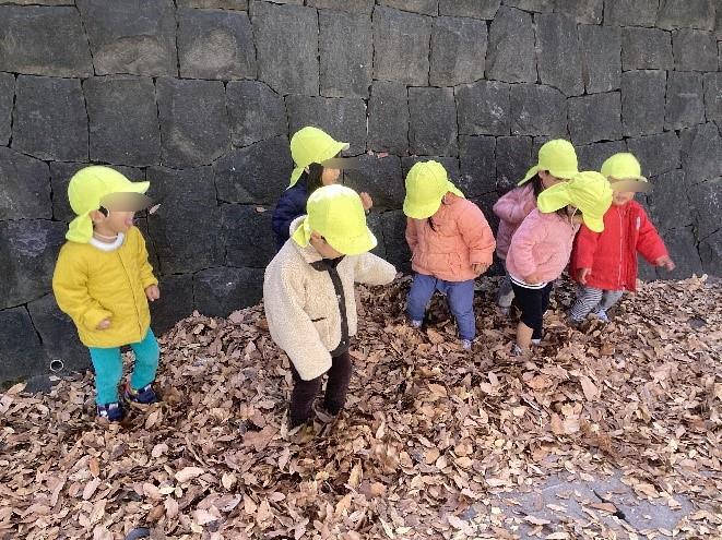 葉が落ち始めた時期には、それを踏んづけたり上を歩いたりして、音を楽しみます。