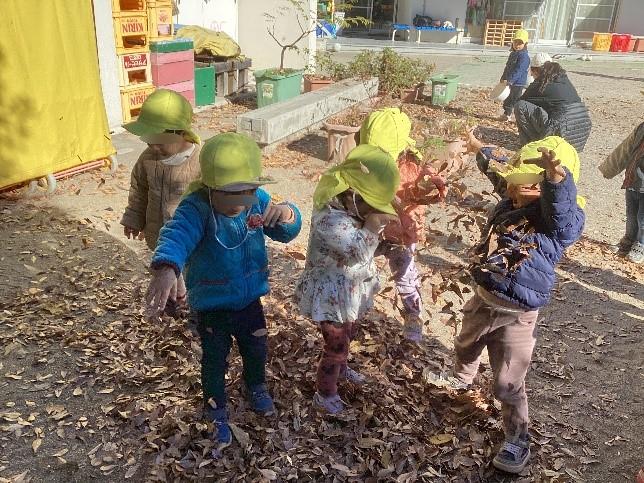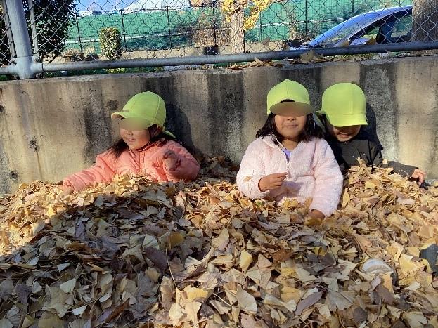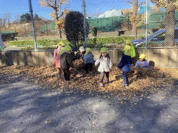 自分達で落ち葉を掛ける役、掛けてもらう役が自然と決まり、みんなで楽しみ始めていました。