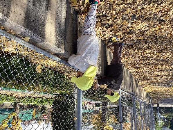 「ゴミ、集めまーす!」と、フェンスをゴミ収集車に、落ち葉をゴミに見立てて、ごっこ遊びをはじめました!